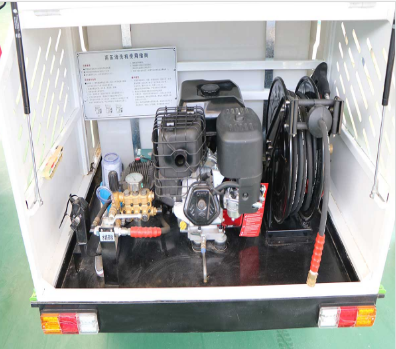7、本車沖洗機為汽油動機泵組,單缸四沖程汽油機,強勁有力最大沖洗壓力240kg;