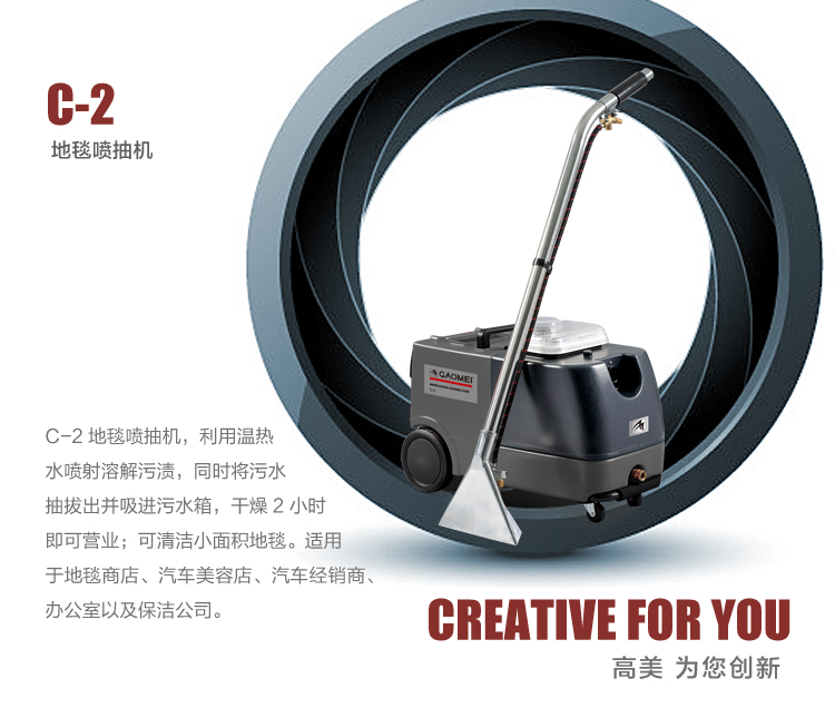 C2地毯噴抽機,利用溫熱水噴射溶解污漬,同時將污水抽拔出并吸進污水箱,干燥2小時即可營業;可清潔中等面積地毯。