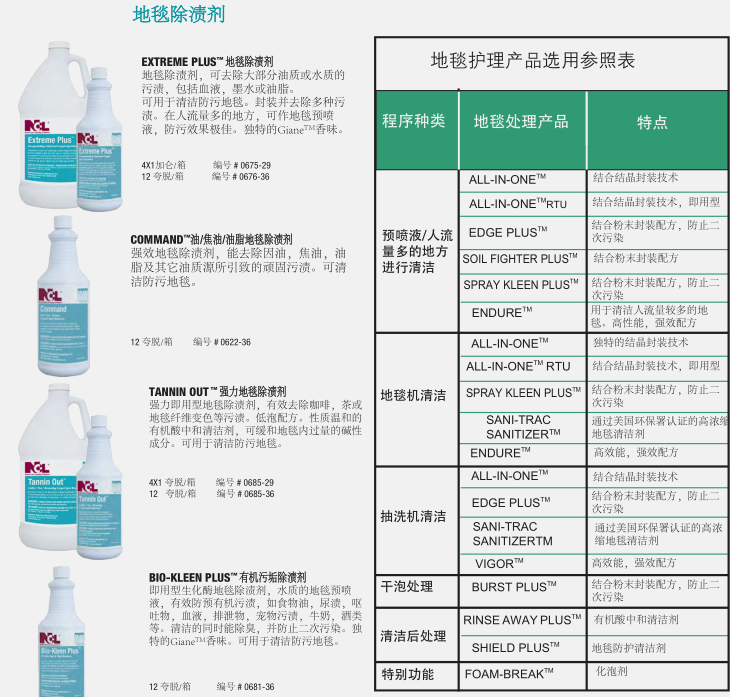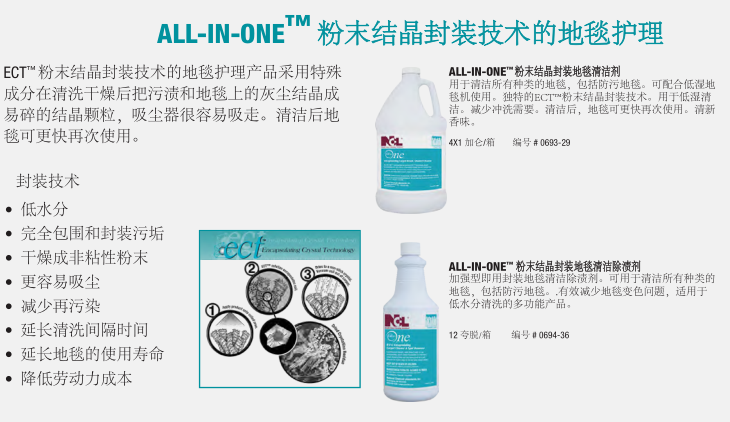 由NCL提供成熟配方產(chǎn)品的地毯護理解決方案,可以延長地毯的使用壽命,維護地毯的靚麗色彩,提供使用者滿意的環(huán)境氛圍和舒適度。NCL提供的全方面的地毯護理產(chǎn)品包括清潔劑、除漬劑、地毯防護劑及其它的配套產(chǎn)品,讓使用者在維護地毯時可以輕易的使用產(chǎn)品,并有效控制成本。特別是我們的ECT™和EPT™粉末結晶封裝技術的防再次污染配方的地毯清潔劑將污垢包裹成一個松脆的、不粘的粉末殘渣,通過常規(guī)的真空吸塵器很容易去除。使地毯更加美麗干凈。其結果是延長了地毯清洗間隔時間,延長了地毯保持干凈的時間。